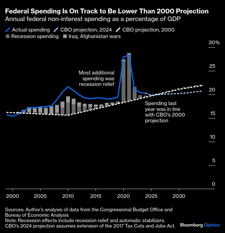 Това очевидно не се е случило. Тогава защо CBO сгреши толкова сериозно? Човек може да си помисли, че CBO просто е сгрешила в прогнозите си, но това е изненадващо малка част от историята. Както показва графиката по-долу, нелихвените федерални разходи през следващата година като процент от БВП ще бъдат почти точно такива, каквито CBO прогнозира през 2000 г. След това последните прогнози на CBO са за по-ниски разходи от тези, които са прогнозирали.