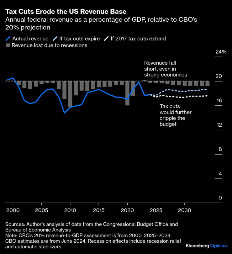 Резултатът е, че намаляването на данъците е съучастник във влошаващата се фискална траектория на Америка. Несъмнено има икономии в разходната част, които могат да бъдат част от разговора, но трябва сериозно да се обмислят по-високи приходи, като тенденцията от 2000 г. за 20% съотношение на приходите към БВП е разумна амбициозна цел.