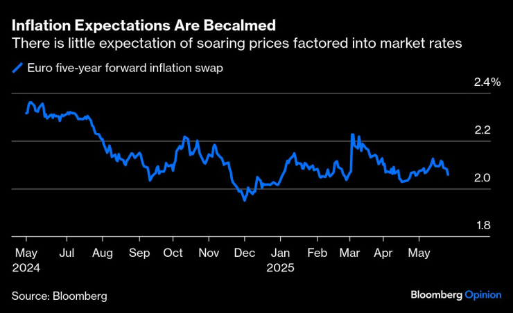 Има обещаващи признаци за инфлацията, които би трябвало да облекчат някои опасения на управителния съвет. Договорената инфлация на заплатите в еврозоната през първото тримесечие се забави до годишен темп от 2,4%, което е значителен спад от 4,1% през последното тримесечие на 2024 г. Главният икономист на ЕЦБ Филип Лейн подчерта в петък, че договорите за заплати показват „доста ниски нива на уреждане за тази година, дори по-ниски за следващата година“. Лейн е „уверен, че инфлацията в услугите ще се понижи“ от темпа от 4%, наблюдаван през април. Инфлацията във Франция падна до четиригодишно дъно от само 0,6% през май, тъй като цените на енергията се понижиха. Управителят на Литовската централна банка Гедиминас Симкус предупреди за риска инфлацията да падне под целта на ЕЦБ от 2%.