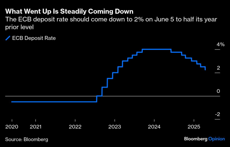 Не се очертава спокойно лято в Европейската централна банка. Тримесечният ѝ икономически преглед на 5 юни би трябвало да дойде с широко очакваното осмо поредно намаление на лихвения процент с 25 базисни пункта. Това означава, че лихвеният процент по депозитите ще бъде намален наполовина през последната година до 2%.