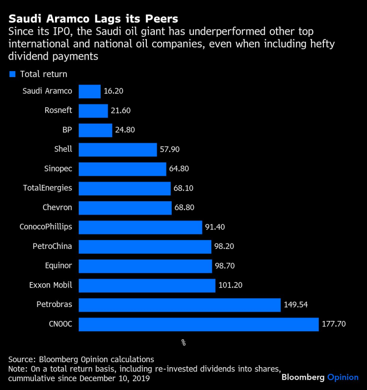 На база обща възвръщаемост, включително реинвестирани дивиденти, Aramco е постигнала едва 16% от първичното си публично предлагане; най-лошият резултат сред някои от най-големите компании в света, според данни, събрани от Bloomberg. Дори санкционираната "Роснефт" от Русия се е представила по-добре. Exxon Mobil Corp., Chevron Corp. и Shell Plc са постигнали обща възвръщаемост от над 50%.